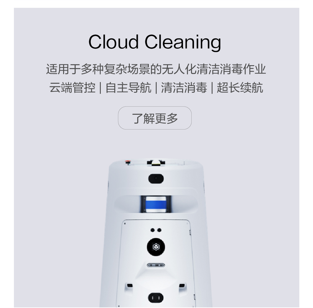 适用于多种复杂场景的无人化清洁消毒作业 云端管控 | 自主导航 | 清洁消毒 | 超长续航 了解更多